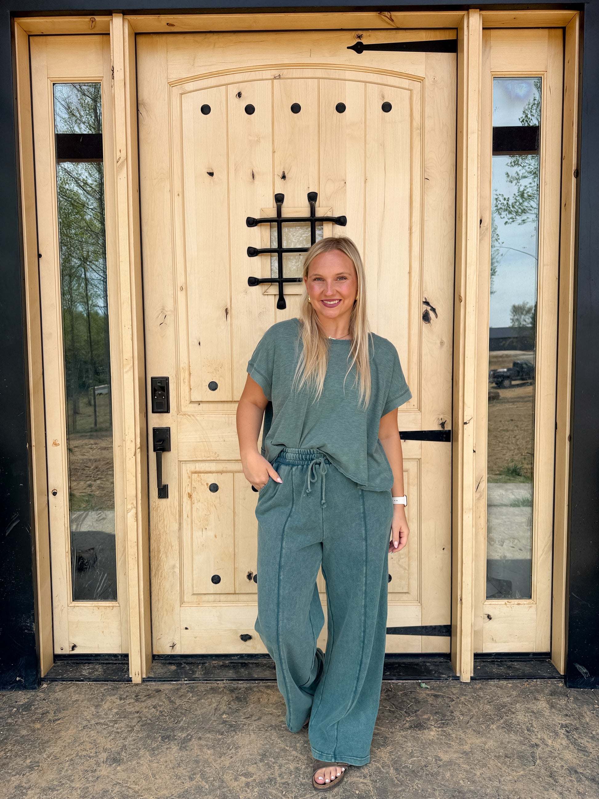 These pants are crafted from acid washed French terry for a vintage look and lived-in feel. The design features a high-rise elasticated waistband with functional drawstring, side-seam pockets, and an oversized wide-leg silhouette, accented with center seam detail at the front. Pair with a crop top and sneakers for a laid-back look.